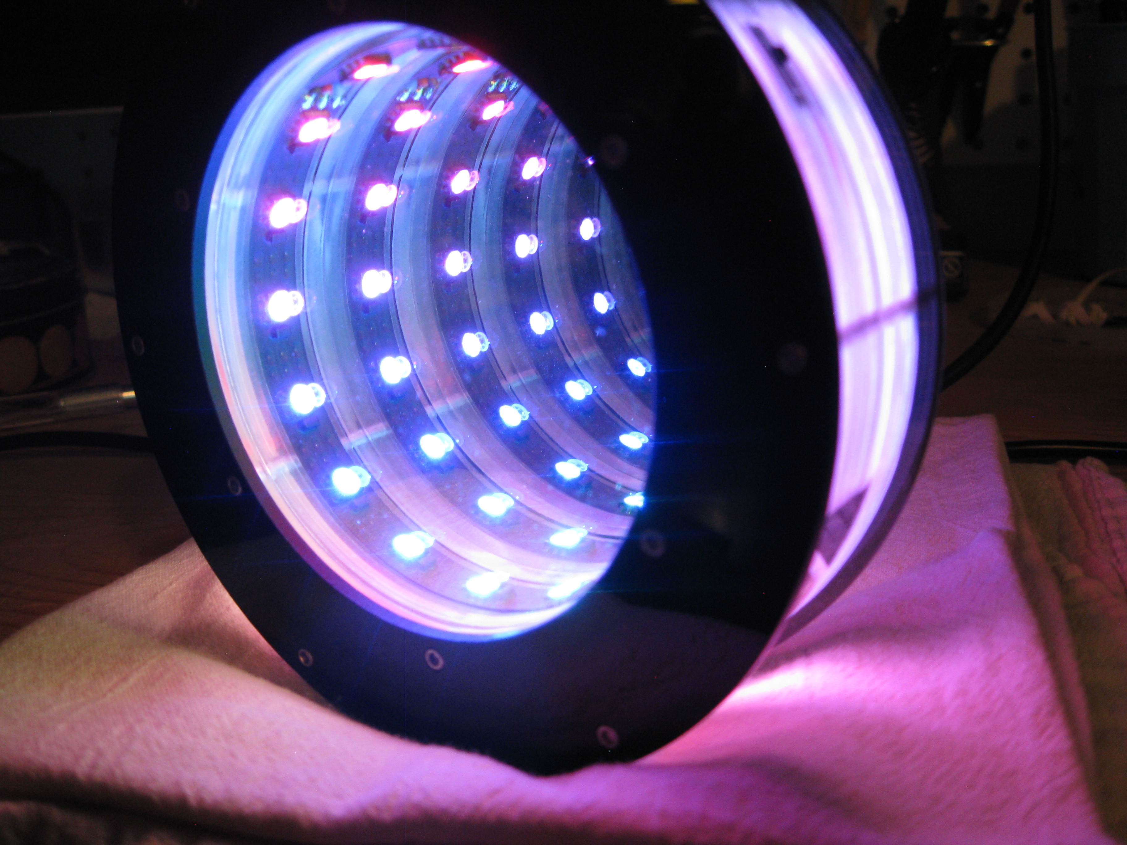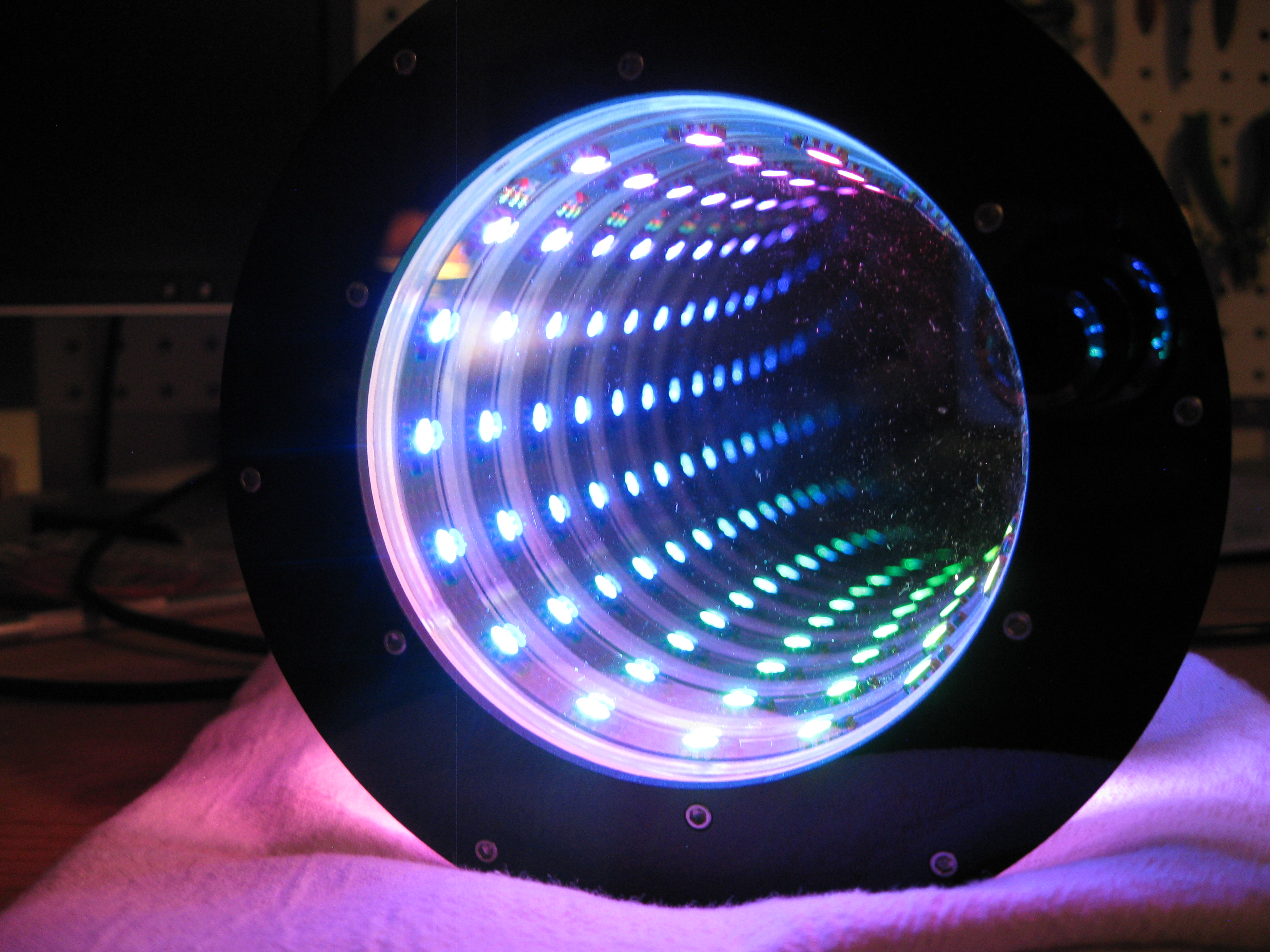 Some late night thinking yielded the idea that resulted in this project, which was cut out from cast acrylic, layer by layer, on my one-off, GRBL-controlled CNC machine. An Arduino Pro Mini drives the NeoPixel RGB LED strip with a demo program, or a microphone can be incorporated into the circuit with the flip of a switch, so that the light pattern is altered by ambient sound. It is all powered by an internal Lithium Polymer battery, which is rechargeable via an external mini USB port. All of the electronic bits are available at Sparkfun www.sparkfun.com and the acrylic is readily available from the hobbyist-friendly Tap Plastics www.tapplastics.com. All of the features, holes, and profiles were designed to be milled with a 1/16” carbide endmill. I wanted to keep the outside diameter of the enclosure as small as possible compared to the diameter of the mirror. As a result, I didn’t leave much room for the wiring and it proved to be somewhat challenging to assemble. The fairly loose tolerance on the thickness of the cast acrylic presented some challenges as well, due to the stacked nature of this assembly. However, the end result is exactly what I had hoped for.