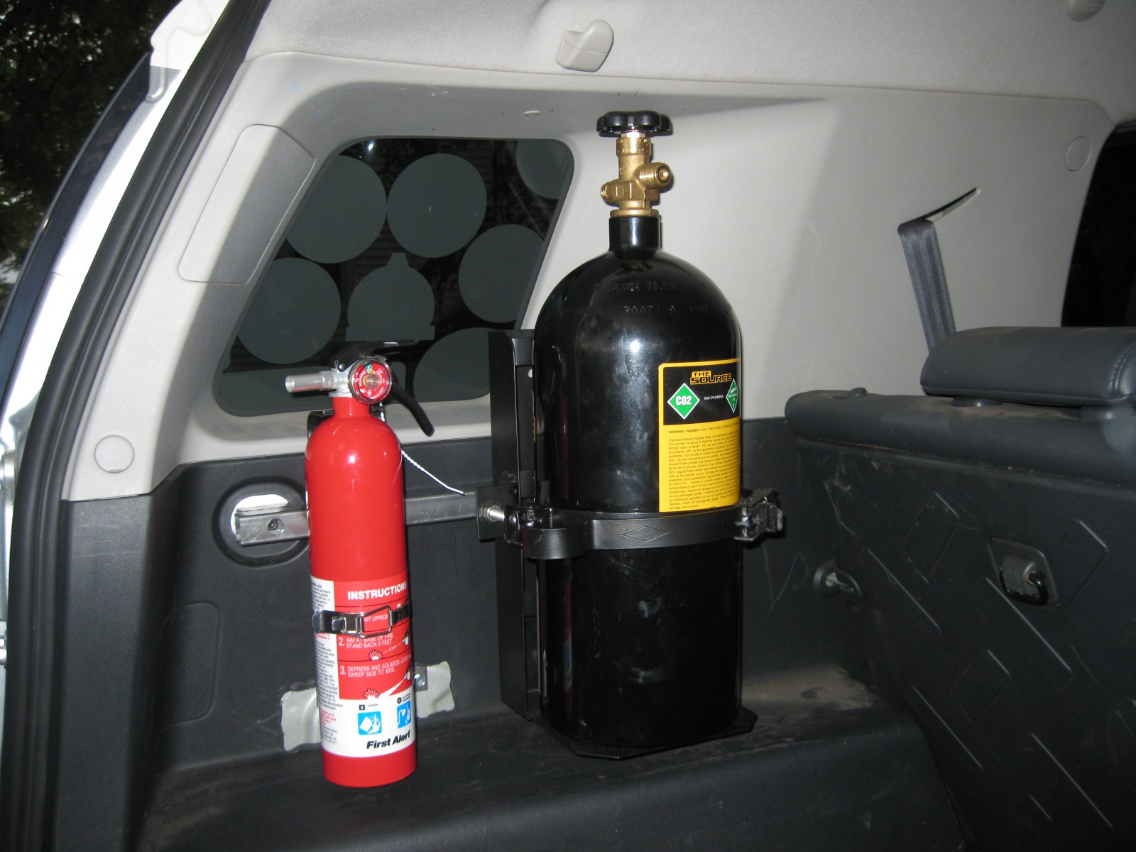My good friend wanted a custom way to stow some gear in his Toyota FJ Cruiser. He showed up with a Power Tank and a fire extinguisher, and we did some brainstorming over a few beers. We had a few simple goals in mind: a robust structure to hold up to years of abuse on rough roads, using existing mounting points where possible, and keeping things compact so we don’t take up too much interior space. This is what we came up with together, and I built with some 1” square tubing I had on hand, using just my TIG welder, an angle grinder, and some clamps.